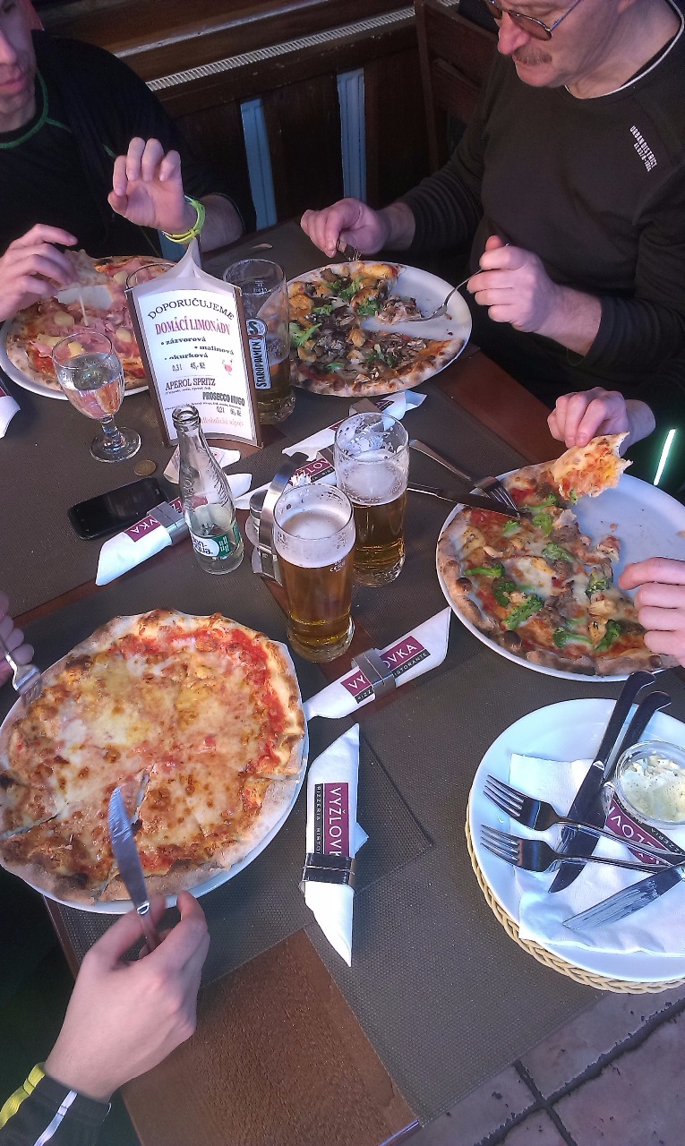 Jak už je naším zvykem, cyklovýlet byl spojen s pizzerií Vyžlovka, kde jsme se před startem pořádně nacpali. Budiž nám omluvou, že ujetých 75 km ve svižném tempu nám doplněné kalorie pomohlo spálit.